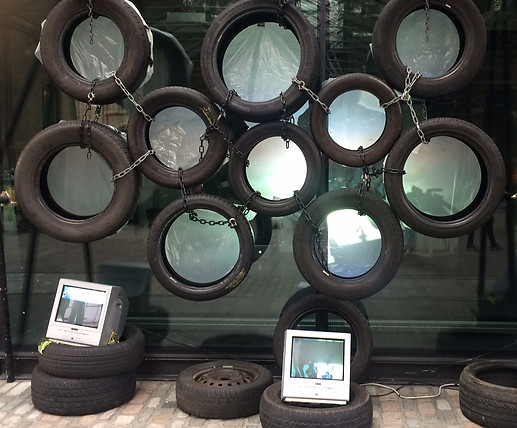 A big installation made out of tyres, project videos mapped into the wholes to tell the story of the punks movement and Joe Rush's company.